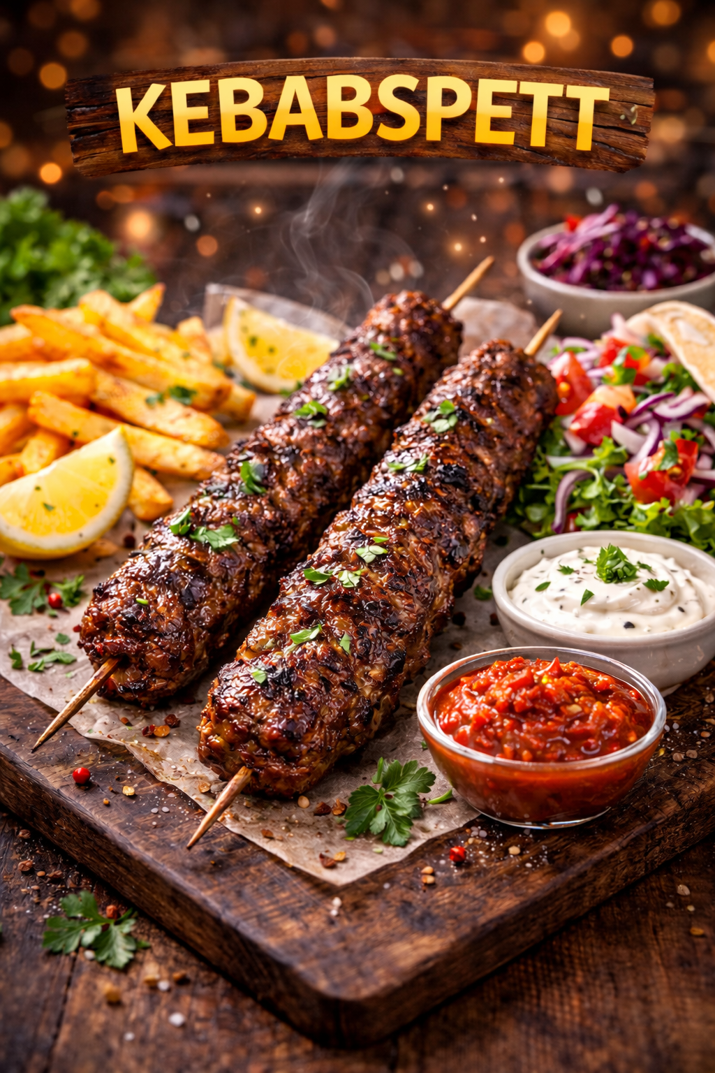 Lammspett, Köttfärs spett, grönsaks spett, grillade paprika, tzatzikisås, ajvarsås