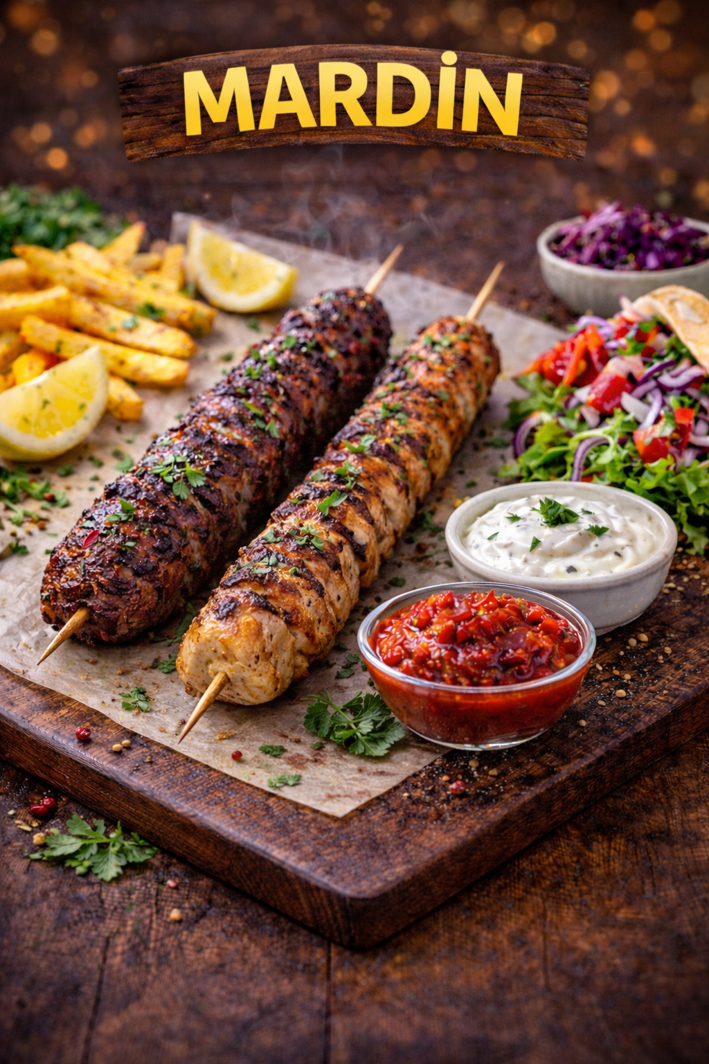 Köttfärsspett, kycklingfilé, fläskfilé, grönsaksspett, tzatzikisås, ajvarsås