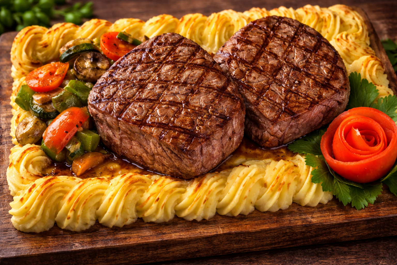 Med friterade grönsaker, rödvinssås och bearnaisesås