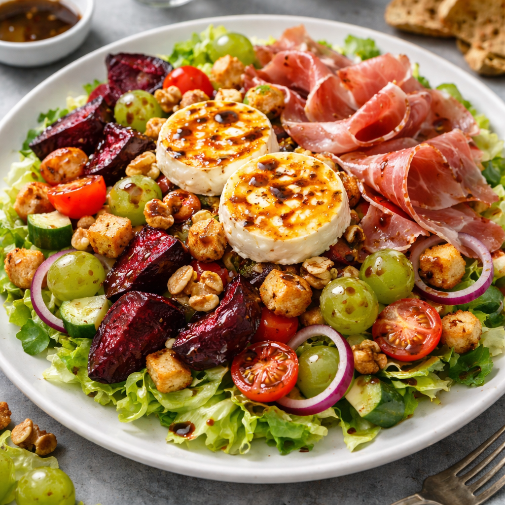 Chèvre (getost) och parmaskinka ,kölsberg tomater, gurka, isbergssallad, , lök vindruvor, valnötter, rödbetor, rostade brödtärningar ,Salladsås